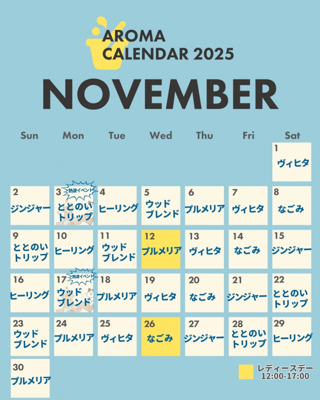 3S HOTEL HIRATSUKAでは、11月もロウリュで使用するアロマを月替わりでご用意しています。